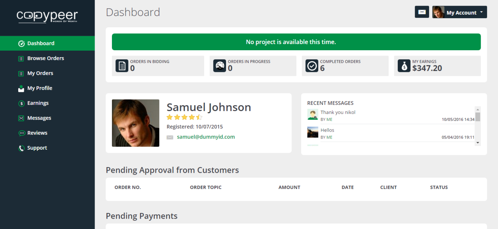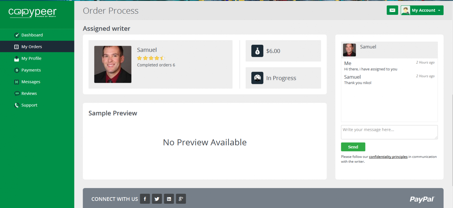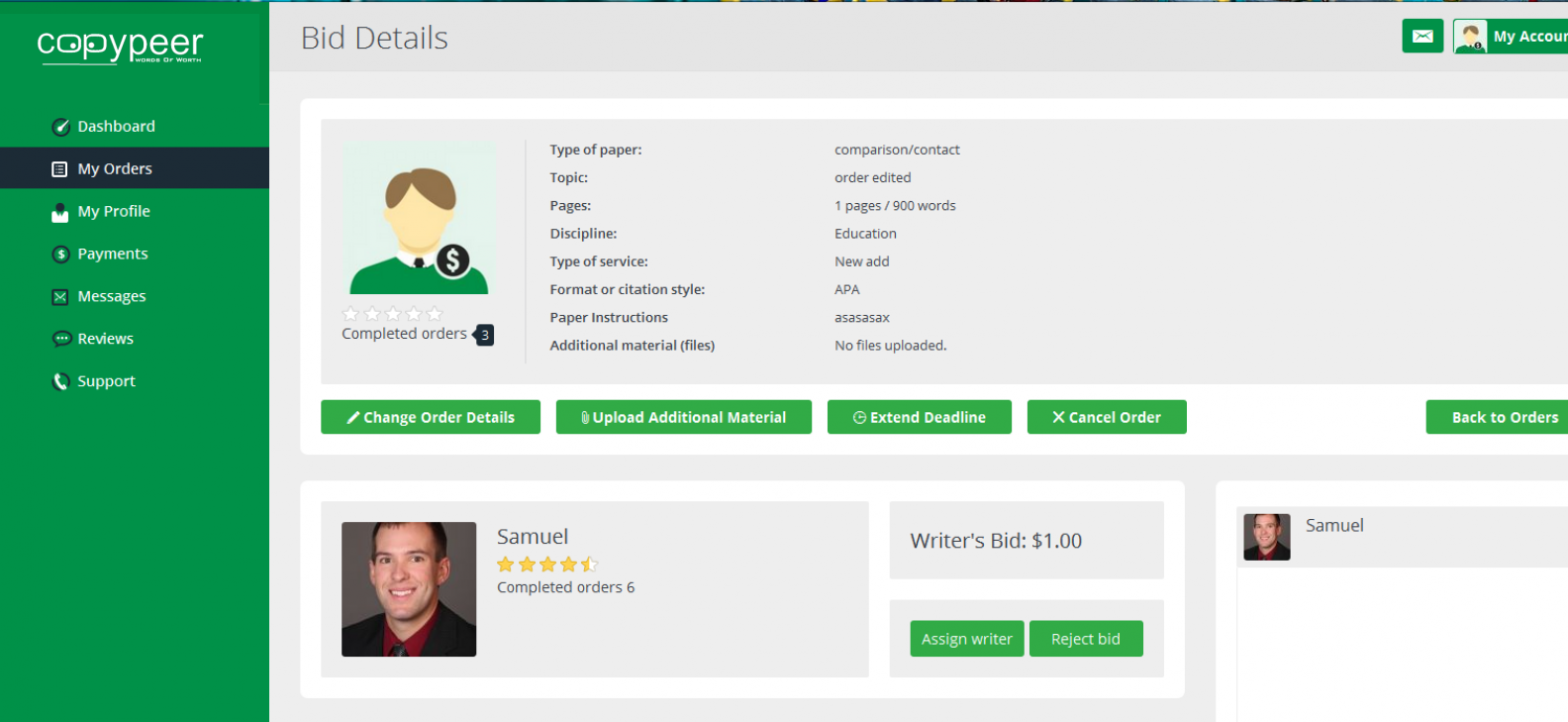 Once you place your order for free, our writers will send their proposals to show their interest in working on your order. You can then talk to them about your requirements, discuss their qualifications, background, and experience in writing. You can also review feedback left by other clients from their profile pages to ensure that you chose the most qualified and proven writer.